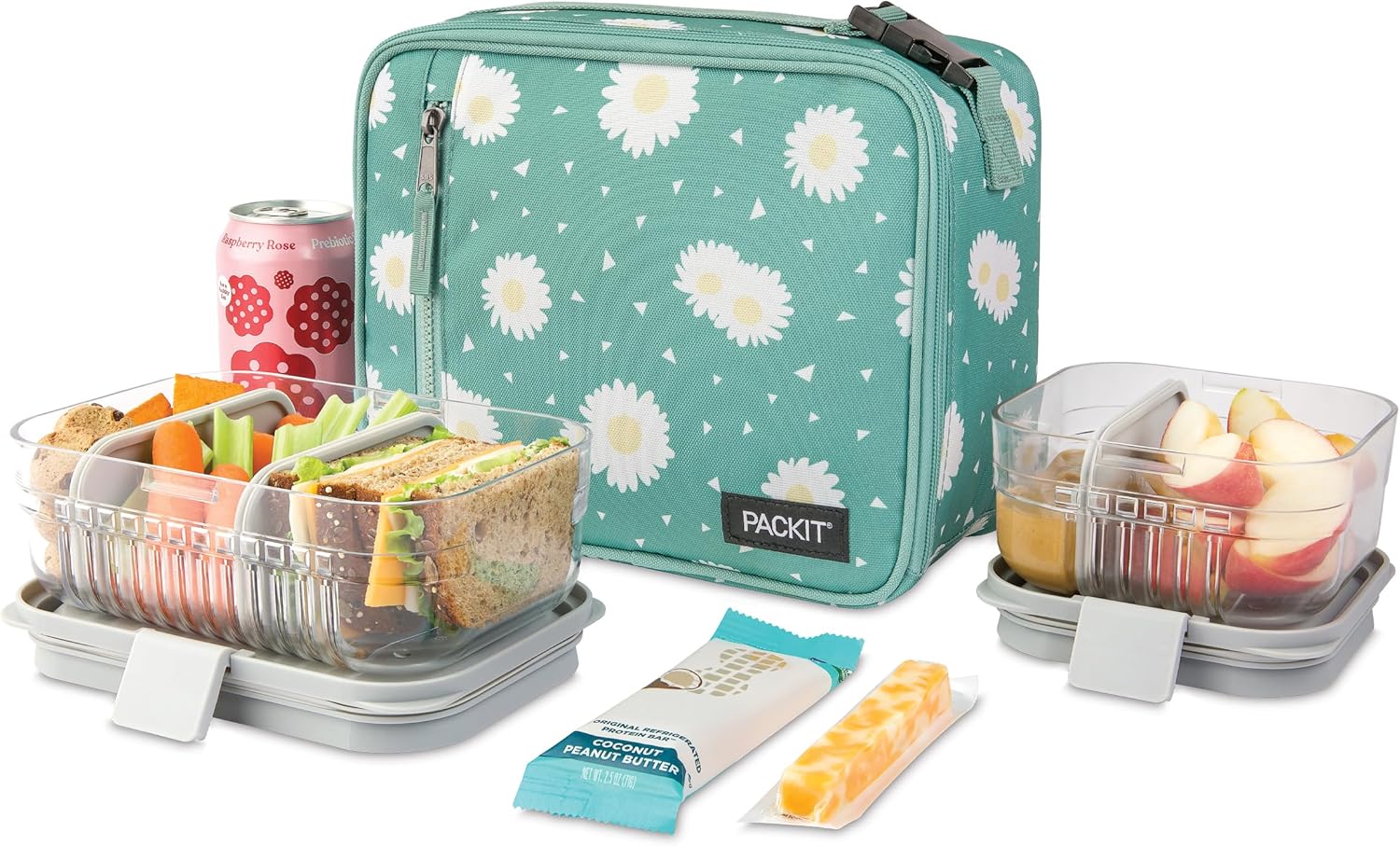PackIt Freezable Classic Lunch Box, Daisy Sage, Built with ECOFREEZE Technology, Collapsible, Reusable, Zip Closure With Zip Front Pocket and Buckle Handle, Designed for Fresh Lunch On the Go