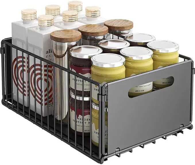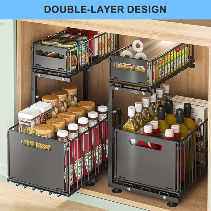 - 【PULL-OUT DOUBLE TIER DISIGN】The pantry organizers and storage can be smoothly pulled out, so that users can easily access the items stored at the bottom. The design transforms an otherwise cluttered and hard-to-reach space under the sink into an efficient and convenient storage area, especially suitable for storage scenarios under the kitchen sink or bathroom cabinets