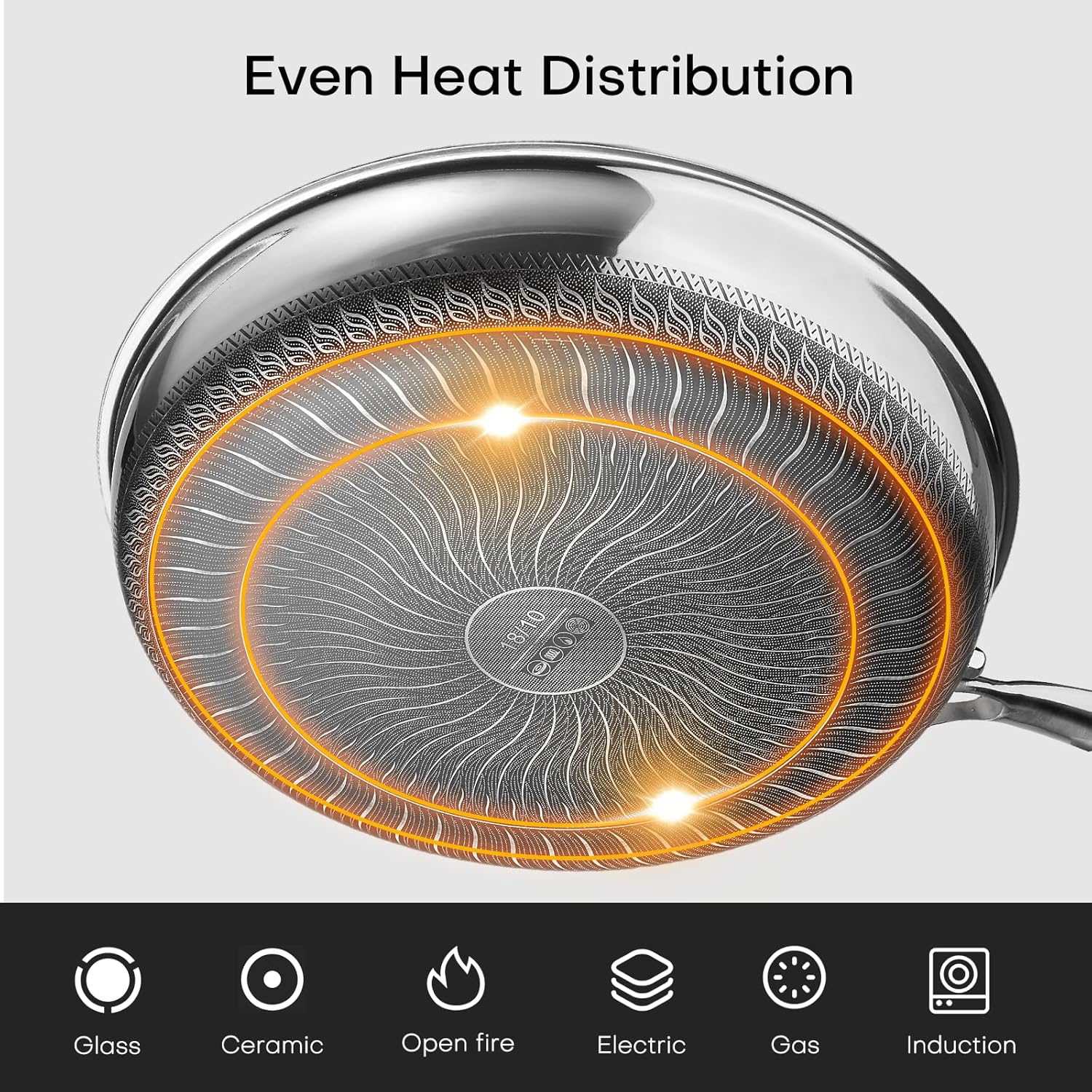 - Premium 18/10 Stainless Steel Construction β Non stick frying pans made with high-quality, coating and the nonstick surface design, durable 18/10 stainless steel for even heating, corrosion resistance, and easy to clean.