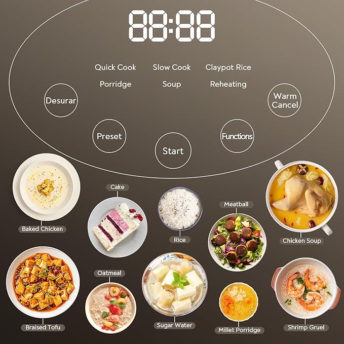 - Function : Slow cook, quick cook, porridge, soups, preset and food warmer. You can use this rice cooker to make low-sugar rice, whole-grain rice, white and black rice; cook millet porridge, oatmeal porridge and baby porridge; stew soup and meat, etc
