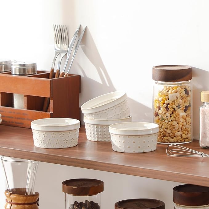 - 【Lydia Ramekins – Timeless Elegance in Every Dish】- The Lydia Collection includes 4 round ceramic ramekins, each featuring a different raised motif. These artfully crafted ramekins bring refined beauty to any dessert table or dinner setting.