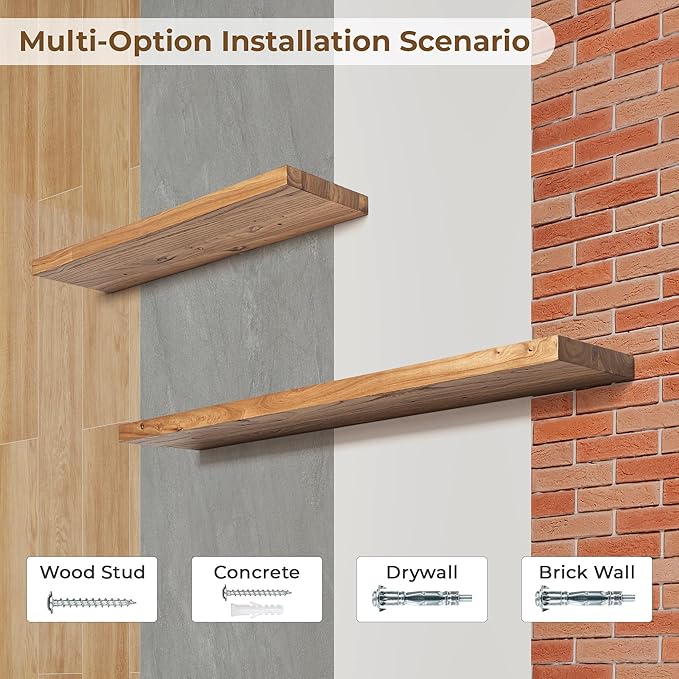 - SMART MOUNTING SYSTEM: Axeman storage wall shelves have a heavy-duty hidden bracket that can be easily installed into wall studs, with each solid wood floating wall shelf capable of holding up to 45 lbs. The flush mount design ensures that the metal brackets are invisible after installation, while screws at the bottom secure the floating shelves from sliding off