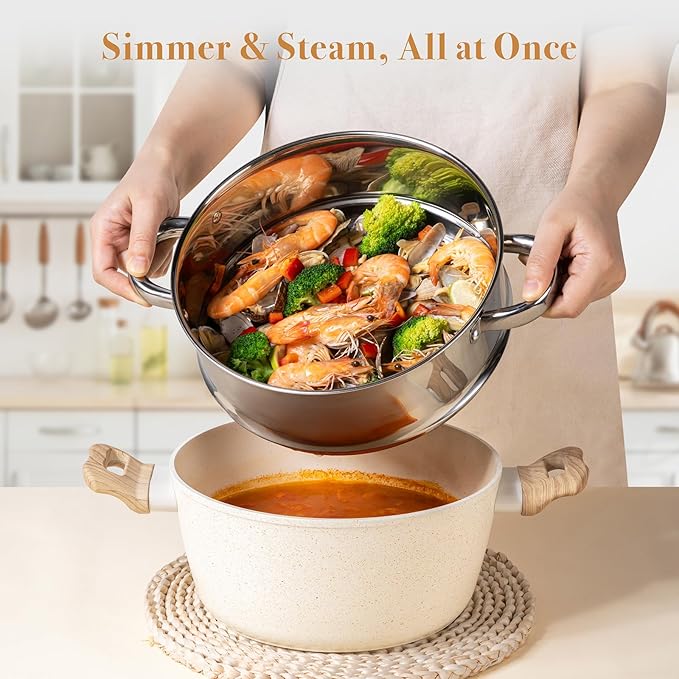 - Stainless Steel Steamer Included: This nonstick cooking set comes with a high-quality stainless steel steamer—perfect for steaming vegetables, seafood, dumplings, or baby food while locking in nutrients and flavor.