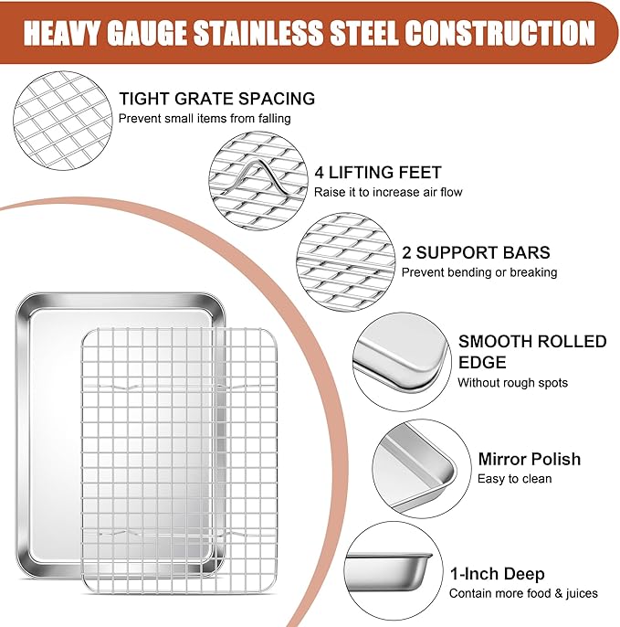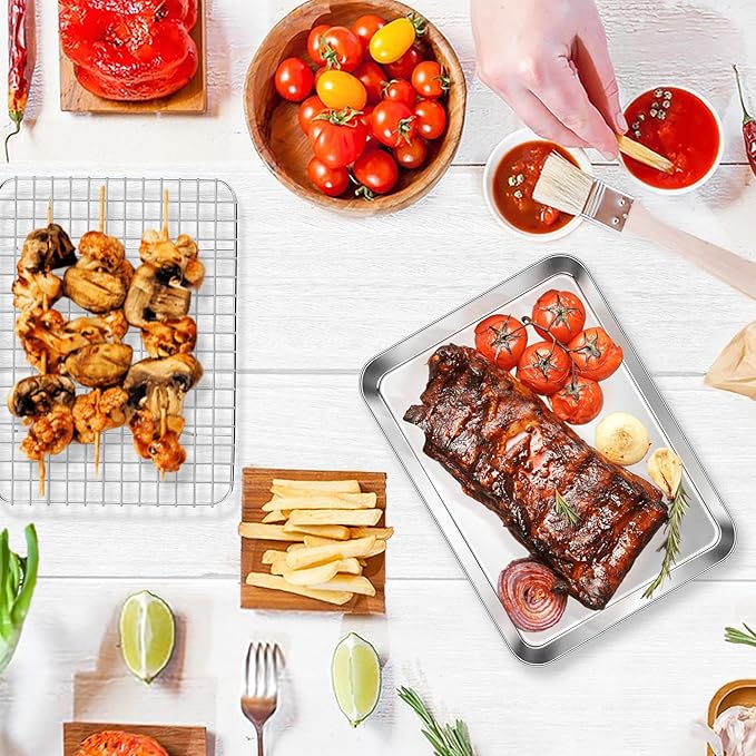 E-far Stainless Steel Baking Sheet with Wire Rack Set, 10.5” x 8.3” Cookie Sheet Baking Pan for Toaster Oven, Small Metal Tray with Cooling Rack for Cooking Roasting, Non-Toxic & Dishwasher Safe
