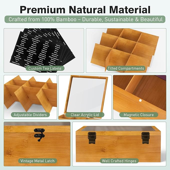 - 🍵9 Adjustable Compartments:Features 9 sections for organizing different tea flavors; removable dividers let you customize the layout to fit your storage needs