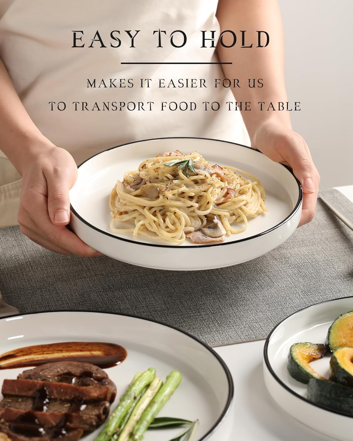 - Exactly What You Need: This ceramic 12 piece dinnerware set includes 6"soup bowls x 4, 8" salad plates x 4, 10" dinner plates x 4. The sizes of the plates are normal for salad and dinner, the bowls are quite big for cereal and soup, it’s both practical for daily use and a chic choice when hosting guests
