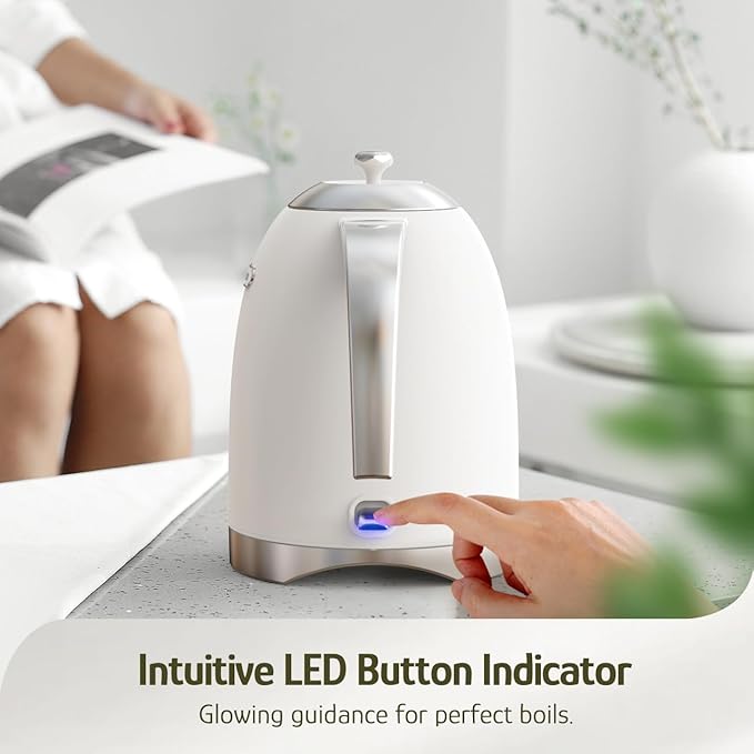 - One-Touch LED Control & Cordless Convenience - Simpler than ever, press the illuminated LED button to start. The cordless kettle lifts off its compact 360° base for tangle-free storage—simply stash the kettle away when not in use, keeping counters clutter-free.