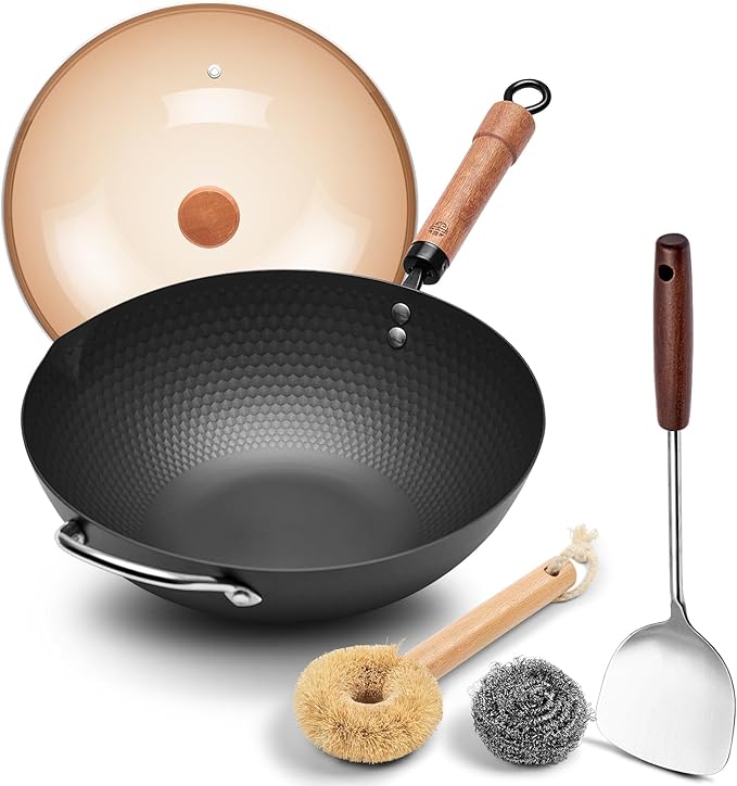 - 【Versatile & Healthy Cooking Wok】 Made of uncoated carbon steel, this non-toxic wok supports healthier cooking without chemical coatings. Ideal for use on induction cooktops, electric stoves, and gas burners, it delivers an authentic Asian stir-fry experience.