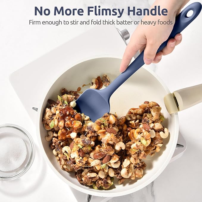- [Extra-Long, Firm and Nonslip Handle] No more burned fingers or struggling with short utensils! Our extra-long 14.17inch/36cm silicone spatula spoon gives you the full reach into deep pots and pans, keeping your hands safely away from steam, boiling water, or hot oil splatters. Unlike flimsy spatulas, our reinforced silicone spoon won't bend when mashing potatoes or flipping meats. The textured non-slip grip stays secure in hand even when wet or greasy, keeping you in full control while cooking.