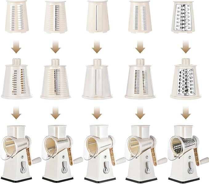 - 5. [INNOVATION & SAFETY DESIGN]: This rotary cheese grater has a built-in strong suction base that can be secured to clean or smooth marble countertops to ensure stability when in use. In addition, the Mandoline slicer has a tilted arc that allows grated ingredients to fall smoothly without clogging We not only provide good rotary cheese grater, but also provide good service. If you have any problems with your kitchen gadgets, please feel free to contact us and we will solve them for you in time!