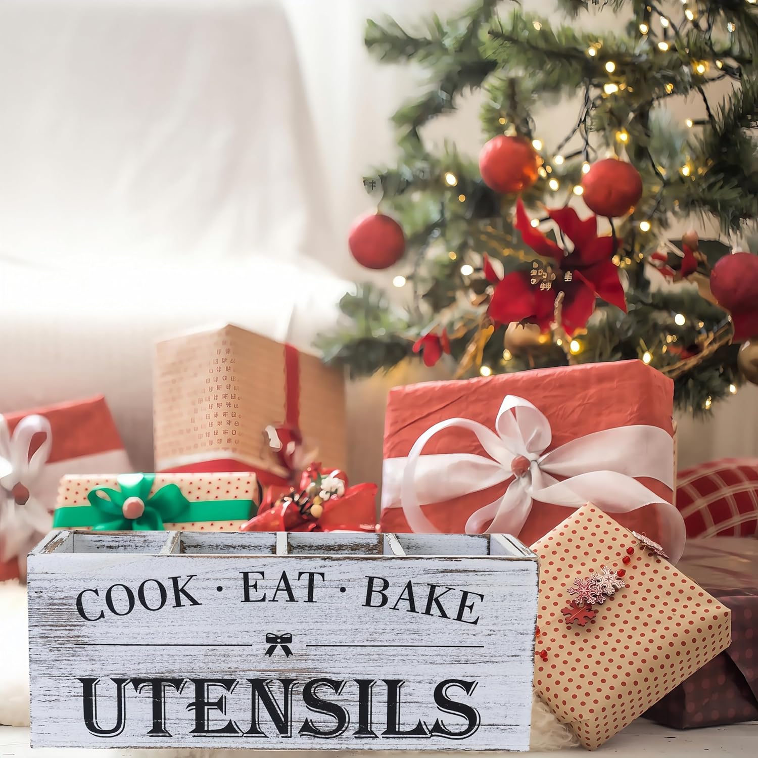 Utensil Holder,Extra Large Wooden Utensil Holder For Kitchen Counter,Cooking Spatula Organizer,Big Storage Caddy With 4 Compartments Flatware Spoon Tool Cutlery(Retro White)