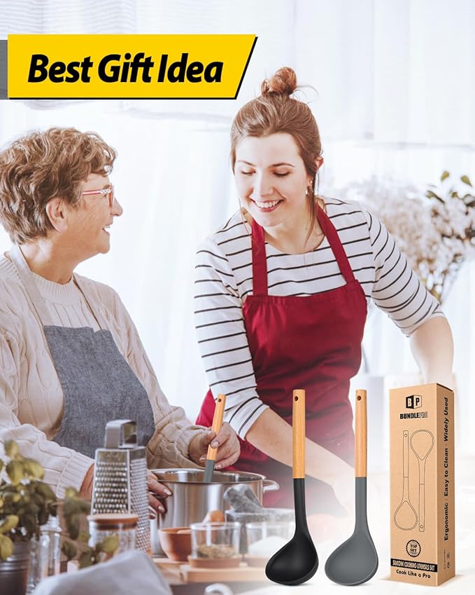 Pack of 2 Soup Ladle, Silicone Ladle Spoon with Wooden Handle, Large Non Stick High Heat Resistant Kitchen Utensils for Cooking, Stirring, Serving Soups(BLACK-GRAY)