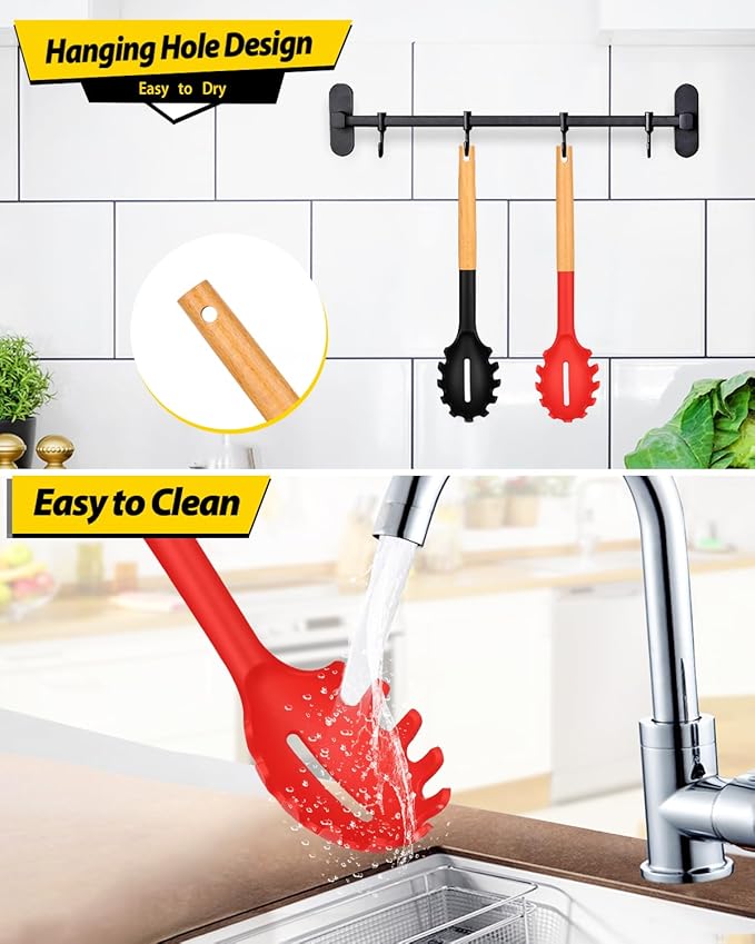 Pack of 2 Spaghetti Spoon, Silicone Pasta Fork with Wooden Handle, Heat Resistant Noodle Spoon Server, BPA Free Spaghetti Strainer(BLACK-RED)