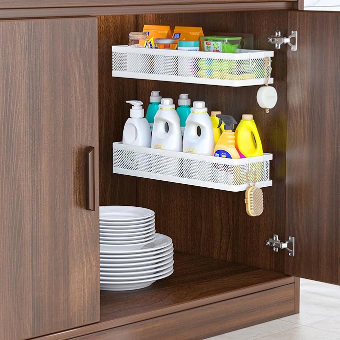 - 【MULTI-PURPOSE&MULTIFUNCTIONAL】5 Hanging Storage Baskets Organizer Set for Sufficient Bathroom Kitchen Storage Space, The bathroom&Kitchen organizer comes with 5 pieces for different uses, including 2 Hanging Storage Baskets, 1 soap holder,1 Tissue holder ,1 utensil holder and 2 adhesives. The perfect solution for organizing a multitude of every items indoor or outdoor. The cabinet organizer hanging baskets wall mount is Ideal for organizing and storing spice bottles, pantry items, snacks, toiletries, tools, craft supplies,etc. And this metal bin basket free up enough space for your homes, kitchen, living room, bathroom, camper, farmhouse, apartments, college dorm rooms, etc.