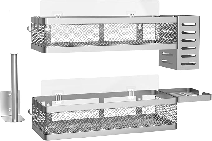 - Included Components : 1 Soap Holder, 1 Tissue Holder, 1 Utensil Holder, 2 Adhesives, 2 Hanging Storage Baskets