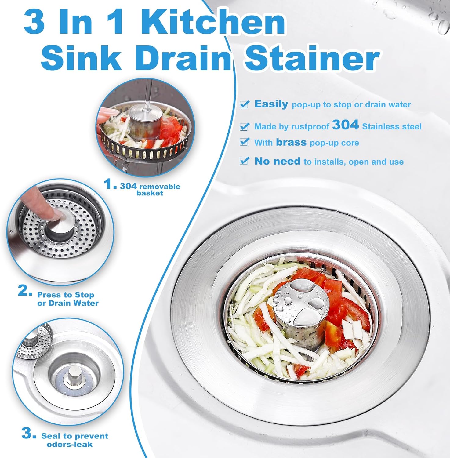- Removable Filter Basket: The inner strainer basket acts as a smart garbage disposal stopper or catcher, trapping scraps before they go down the drain hole. Simply lift the basket to discard waste—no mess, no hassle, no clogging. Note: Excessive food waste may make it difficult to drain the drainage holes. Please ensure that waste does not block the drainage holes of the basket.