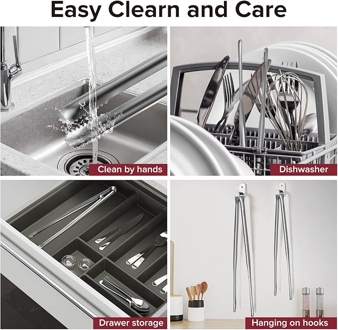 - Dishwasher Safe & Space-Saving Storage: The food tongs are easy to clean, just clean by hand or dishwasher. The top of tongs support to hang on the hook, or storage in cabinet, keep your kitchen always stay tidy and orderly