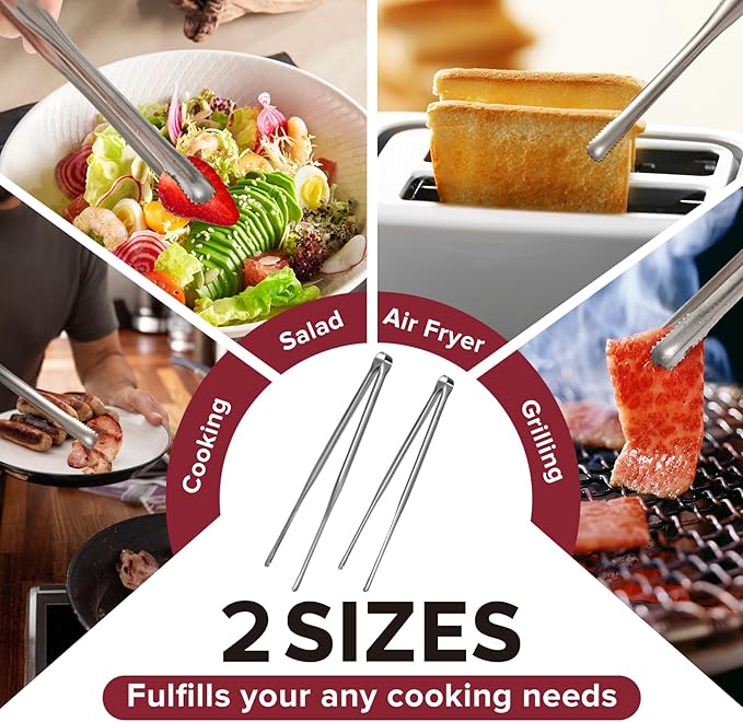 - Extended 9" & 12" Set Aid Every Cooking Task: We extended the handle, making these two sizes of tongs easily used in high and low heat cooking tasks, protect your hands, also handle things from small pieces to larger cuts, ideal for cooking, air frying, grilling, and more