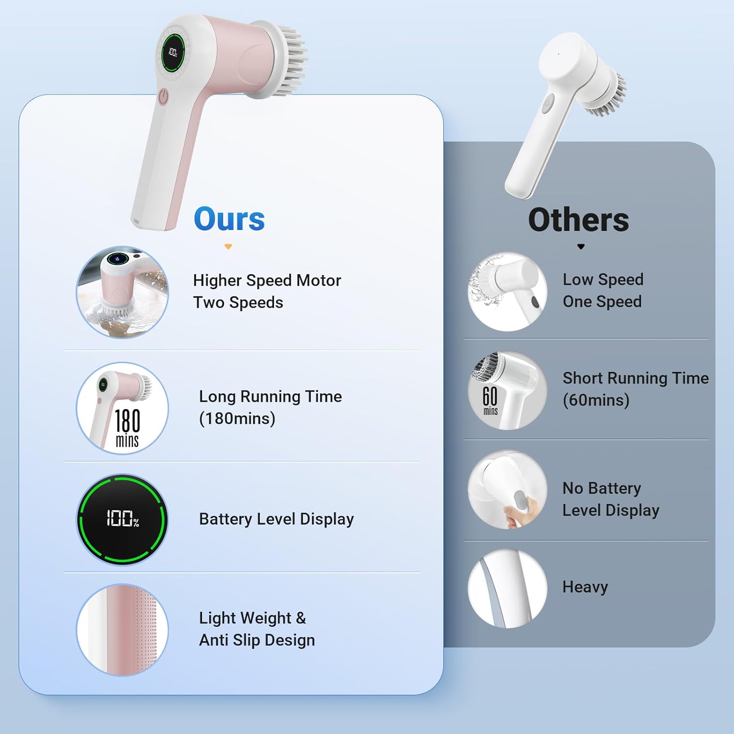 - Lightweight & IPX7 Waterproof: Cordless electric cleaning brushes with a lightweight design ensure comfortable use on your wrist, even during extended cleaning sessions. IPX7 waterproof provides you with the flexibility to use the scrubber in various environments safely. After cleaning, you can clean electric bathroom scrubber under running water, keeping the device clean and tidy.
