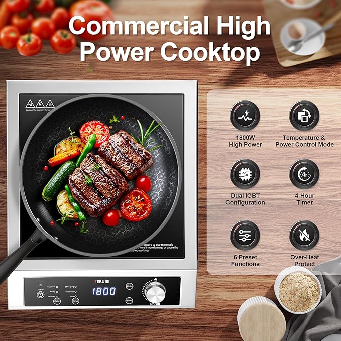 Induction Cooktop Commercial, 1800W Electric Stove with 18/10 Stainless Steel, 4 Hours Timer, 6 Preset Functions, 8 Temp/Power Levels, Portable Countertop Burner for RV Home Kitchen