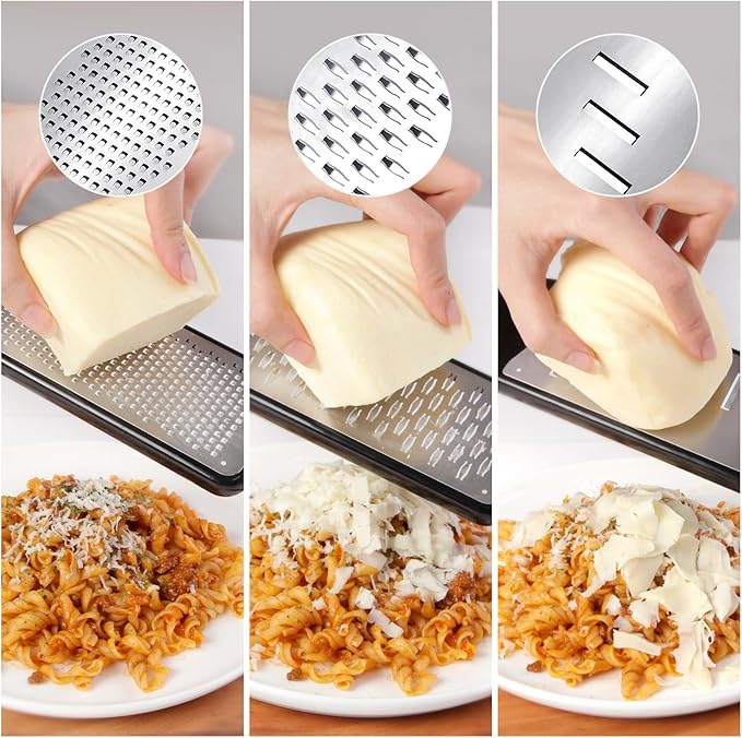 - For Your Different Needs: The multi-functional grater for Parmesan, lemon, ginger, garlic, nutmeg, chocolate, cinnamon, zucchini, vegetables and citrus fruits.