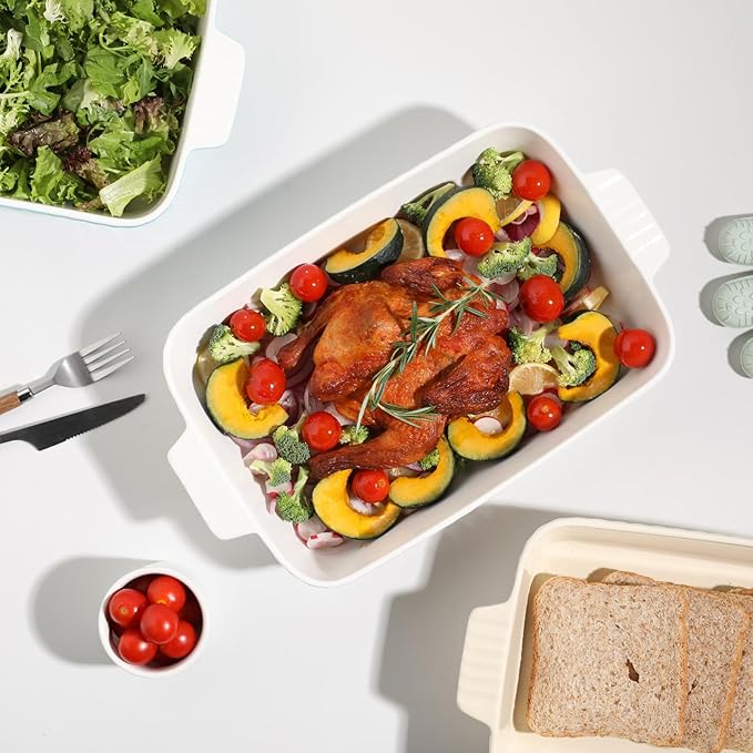 - Ethical & Effortless - Bake with uncompromised peace of mind. Our ceramic baking dishes for oven is naturally non-toxic and free from lead, and synthetic coatings—pure ingredients meet pure materials. Oven-to-dishwasher safe, it cleans up effortlessly without soaking or scrubbing. The stain-resistant glaze repels tomato sauces and spice stains, while the chip-resistant edges survive busy kitchens. Eco-friendly durability meets everyday convenience.