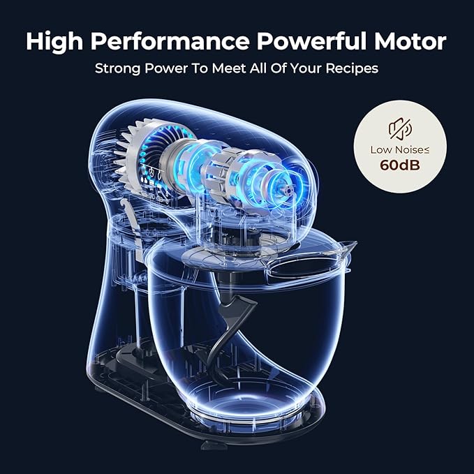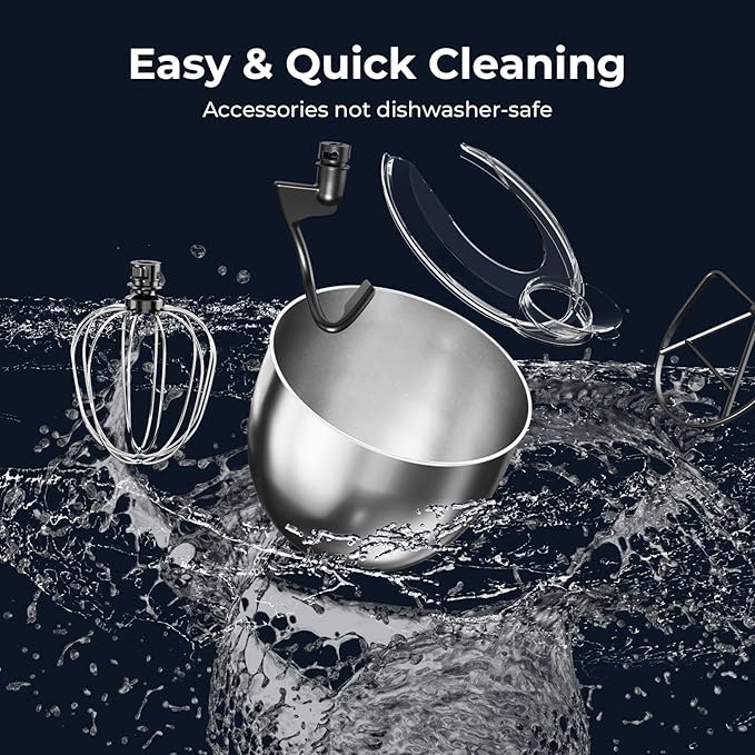 - The food mixer has a 5.3QT stainless steel mixing bowl, perfect for mixing and cooking a wide variety of ingredients, suitable for new bakers, 1-2 person families or couples with enough capacity to make all types of breads; cookies; pizzas; buttercream and salad mixes, easy to operate and clean.