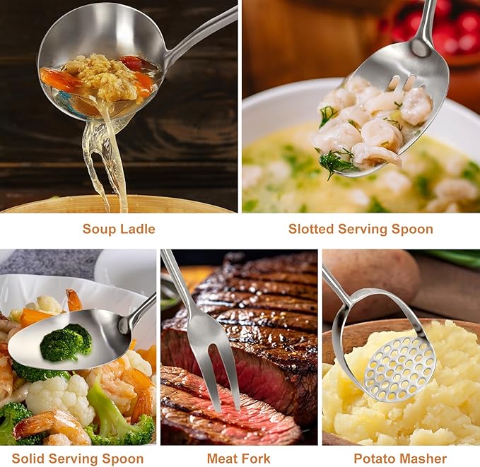 - COMPLETE 12-PIECE SET: This 304 stainless steel kitchen utensils set has everything you need! It includes 1 potato masher, 2 tongs, 1 meat fork, 1 solid serving spoon, 1 slotted serving spoon, 1 spatula, 1 skimmer spoon, 1 slotted spatula turner, 1 soup ladle, 1 spaghetti spoon, 1 large spoon. Whether you're cooking a quick weeknight meal or hosting a big dinner party, this 12-piece metal utensils set has the right tool for every task
