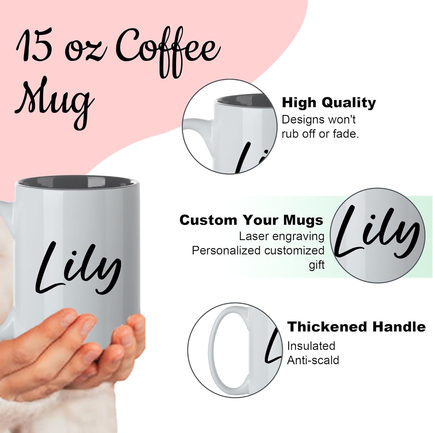- 15oz Laser Engraved Ceramic Cup: Durable, microwave safe, dishwasher friendly, ideal for coffee, tea or hot chocolate, with an ergonomic handle for comfortable use. High-precision technology ensures that the text and design are clear and fade-resistant for a “customized mug that lasts a lifetime”.