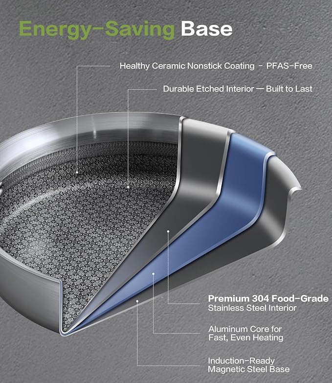 - ENERGY-SAVING BASE & INDUCTION COMPATIBLE :The ECO-EFFICIENT TRI-PLY BASE distributes heat evenly for faster cooking and less energy waste. Works perfectly on all stovetops, including INDUCTION, electric, and gas.