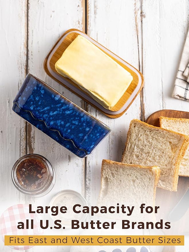- Enhance Your Kitchen Decor: Add a farmhouse touch to your kitchen with this ceramic butter dish with lid. Available in 4 stylish colors, the honeybee pattern on the wooden lid and wave design complement any kitchen decor.