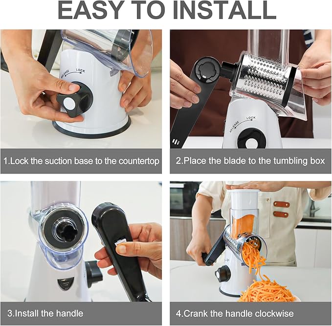 - Three Blades: Coarse shredding blade, fine shredding blade with different diameter ; One slicing blades; A pound of cheese is only 30 seconds, avoid contact between fingers and blades