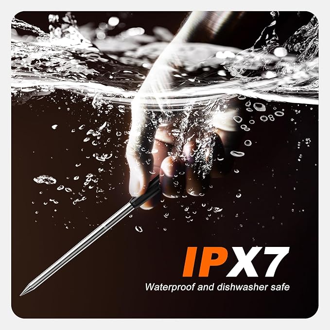 - Dual-Probe Precision & Heat-Resistant Design: Ultra-thin IPX7 waterproof wireless meat probes with ceramic handles ensure rapid heat transfer and meat integrity. Dishwasher-safe sensors monitor internal meat and ambient temps, while heat-resistant materials withstand extreme cooking environments.