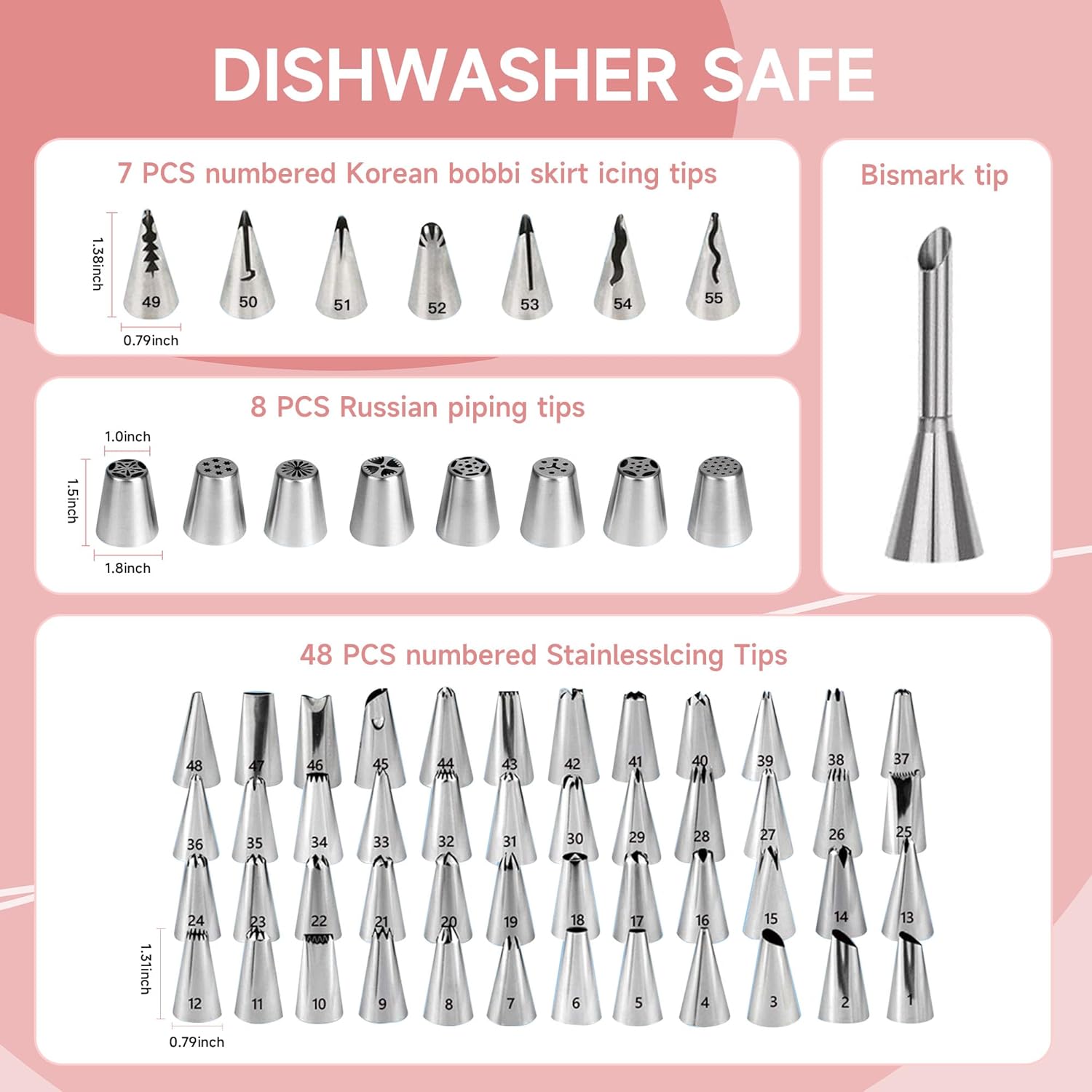 - Piping Bags and Tips Set: Includes 64 numbered icing piping tips, 30 disposable & 2 reusable 12โ frosting pasty bags. Allow you to create a variety of designs, including simple dots and lines as well as intricate flowers and leaves. The included coupler makes changing tips on your piping bags a breeze without emptying the bag or creating any mess.