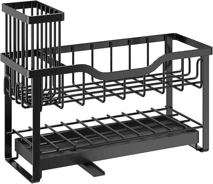 2-Tier Sponge Holder for Kitchen Sink, Caddy Organizer with High Brush Holder, Durable & Rustproof Kitchen Sink Accessories (Black)