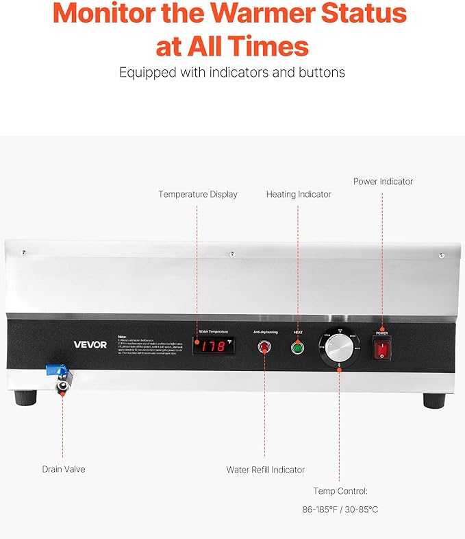 - Durable for Long-term Use: Made entirely of stainless steel, this bain marie food warmer is corrosion-resistant, waterproof seal, and able to withstand the harsh kitchen environment, including exposure to grease and acidic or alkaline substances