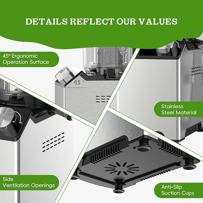 - 【Designed with Your Experience in Mind】: This electric juicer incorporates many thoughtful design details: a comfortable 45° angled control panel, a durable stainless steel body shell, an enhanced cooling system to extend its lifespan, and non-slip, vibration-absorbing suction cups... These innovative features are all intended to provide you with an exceptional user experience!