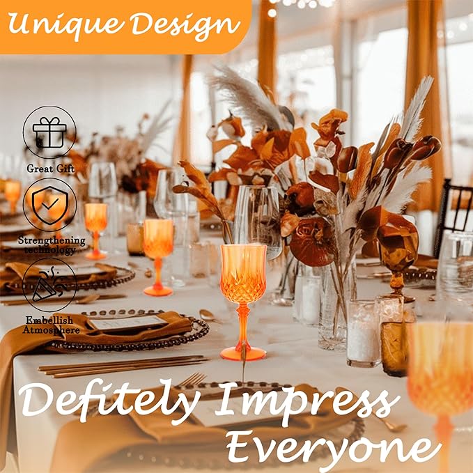 - 🍷🍷🍷【Product Description】 This set includes 12 retro-style pumpkin orange party plastic wine glasses, providing ample quantity to meet your daily use and replacement needs. The elegant and sophisticated design makes your wedding reception unique.