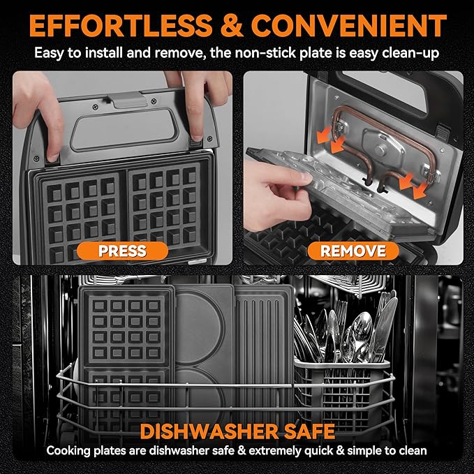 - [EFFORTLESS CLEANUP]: The non-stick surface eliminates the need for oil or butter, promoting healthier eating and simplifying cleanup. Simply wipe the surface with a soft towel and rinse, or disassemble the plates for dishwasher cleaning.
