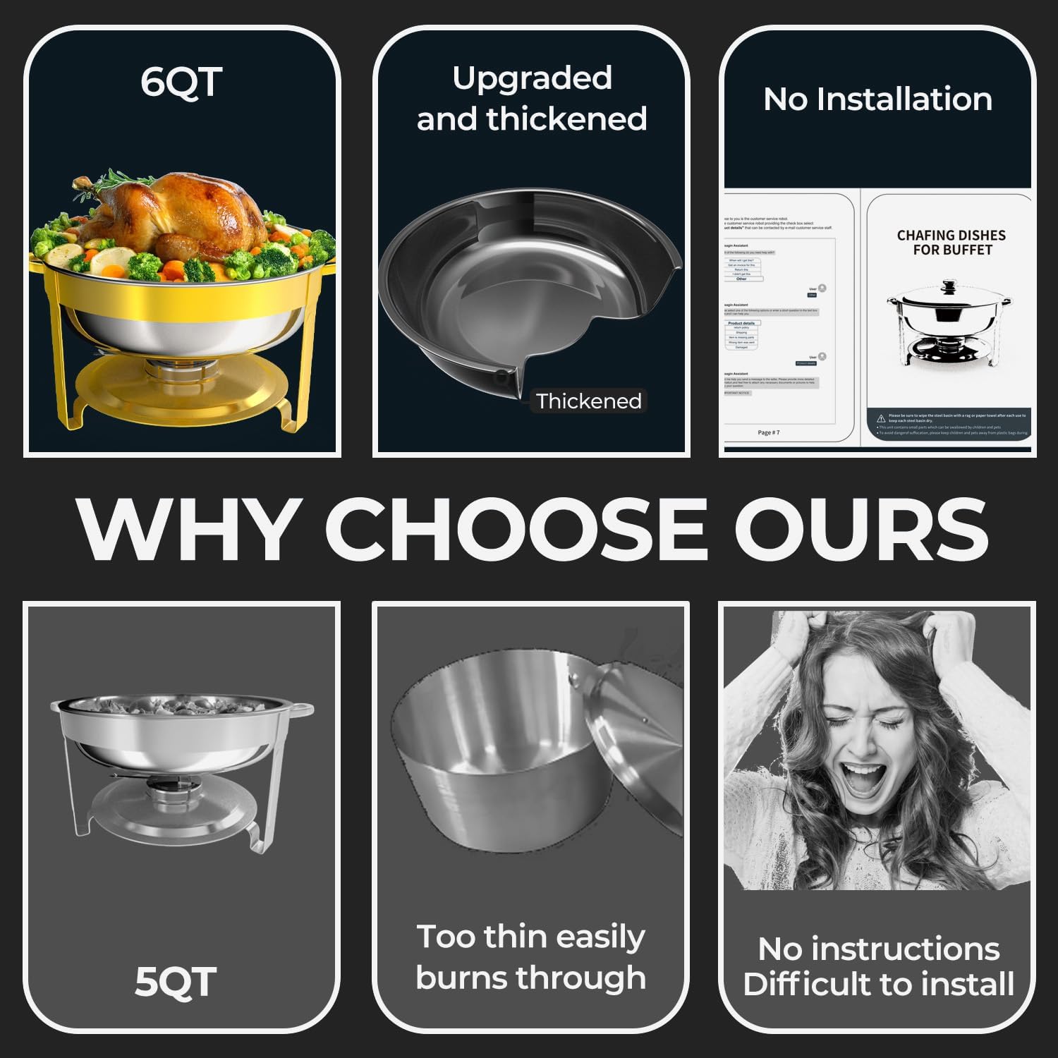 - Adaptable for Various Occasions Whether it’s a corporate luncheon or a school celebration, these chafing dishes are suitable for a variety of settings. With a spacious 6-quart capacity, they’re perfect for main dishes, side courses, or desserts. Combining sleek aesthetics with long-lasting performance, they’re an ideal choice for both casual and professional use.