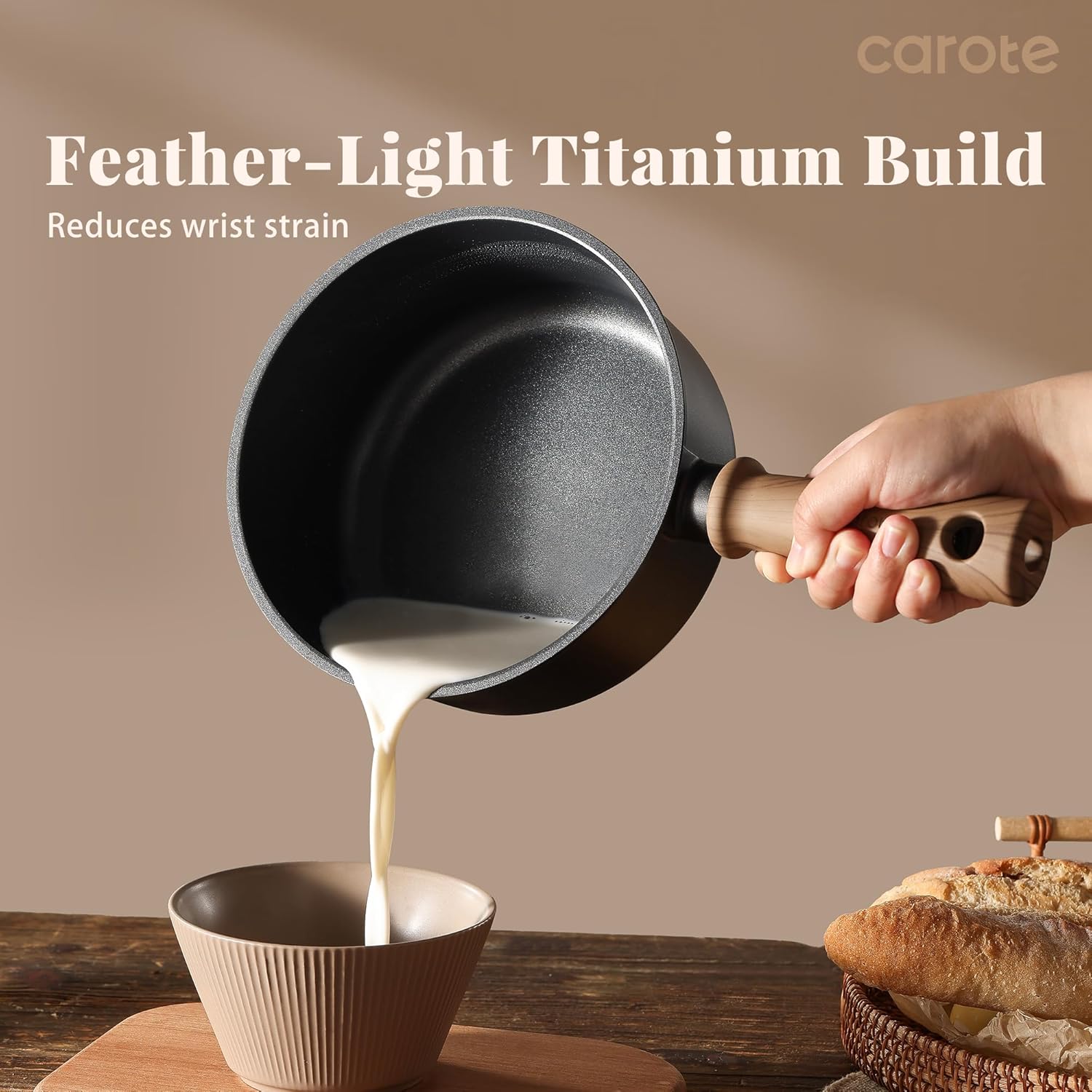 - [HEALTHY TITANIUM-CONTAINING SAUCE PAN] Compared with general sauce pans, the addition of titanium in the manufacturing process makes CAROTE sauce pan set lighter in weight, easier to hold, and has more even heat distribution. It also has excellent corrosion resistance and is completely non-toxic to the human body.