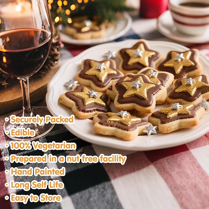 - Versatile Dessert Decoration:Our sprinkles includes 2 different sizes of Gold star,perfect for meeting all your baking decoration needs.The sugar decorations are edibled candies.It is normal for large candies to have a hard texture and can be eaten with confidence.After baking,decorate the cookies or cake with star sugar to avoid melting