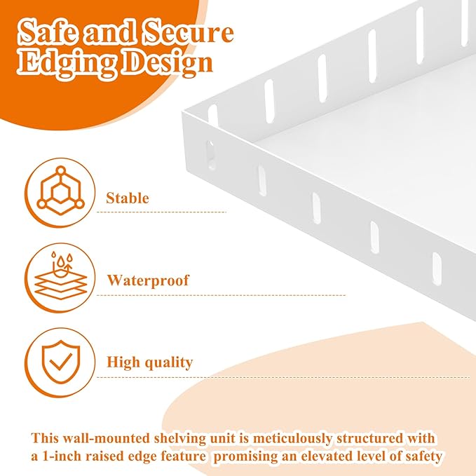 - Safe & Secure Edging: This wall-mounted shelving unit is meticulously structured with a 1-inch raised edge feature, promising an elevated level of safety. It confidently safeguards your belongings from slipping off, offering a serene, free-of-worry storage alternative.