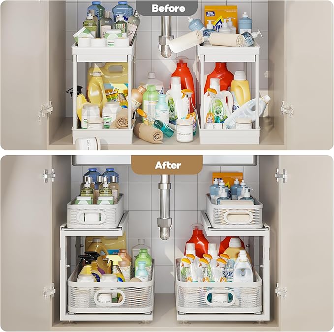 - 【2-Tier Pull Out,No More Strenuous Bending】Both upper and lower drawers glide out effortlessly, with no noise or jamming, giving easy access to items at the back of your cabinet without crouching or digging through clutter. Built-in stoppers prevent over-pulling, while suction cups at the base enhance stability for worry-free use.