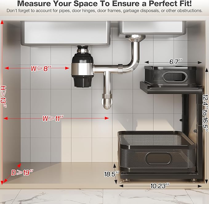 2 Pack 18.5IN-Depth Under Sink Organizer With Next-Gen Ball-Bearing Slides,2-Tier Precision Mesh Pull Out Cabinet Storage for Bathroom&Kitchen,Height Adjustable Drawers Shelf,Anti-rust-Black