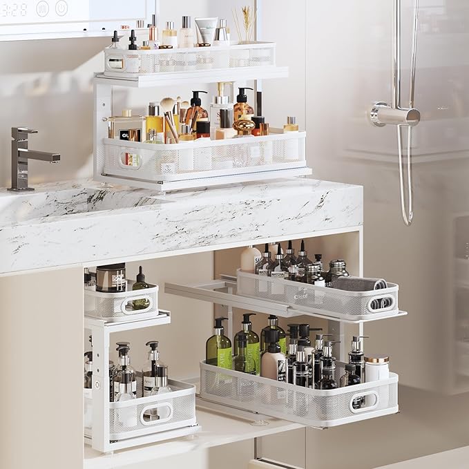 2 Pack 21IN-Depth Under Sink Organizer With Next-Gen Ball-Bearing Slides,2-Tier Precision Mesh Pull Out Cabinet Storage for Bathroom&Kitchen,Height Adjustable Drawers Shelf,Anti-rust-White