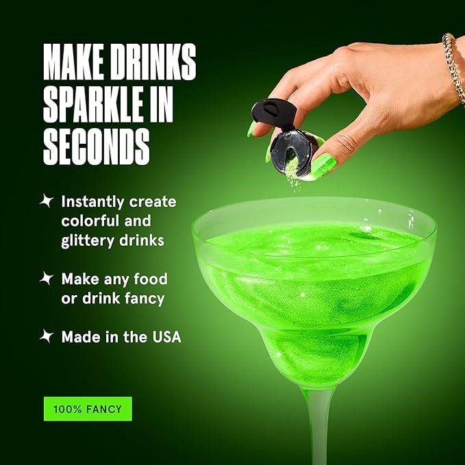 - GLITTERY FOOD & DRINKS: Fancy Edible Glitter is a fine prismatic powder formulated for both food and drink. Add edible glitter to still and carbonated beverages and spirits to create a glittery hurricane, or dust onto desserts and savory items for a sparkly finish.