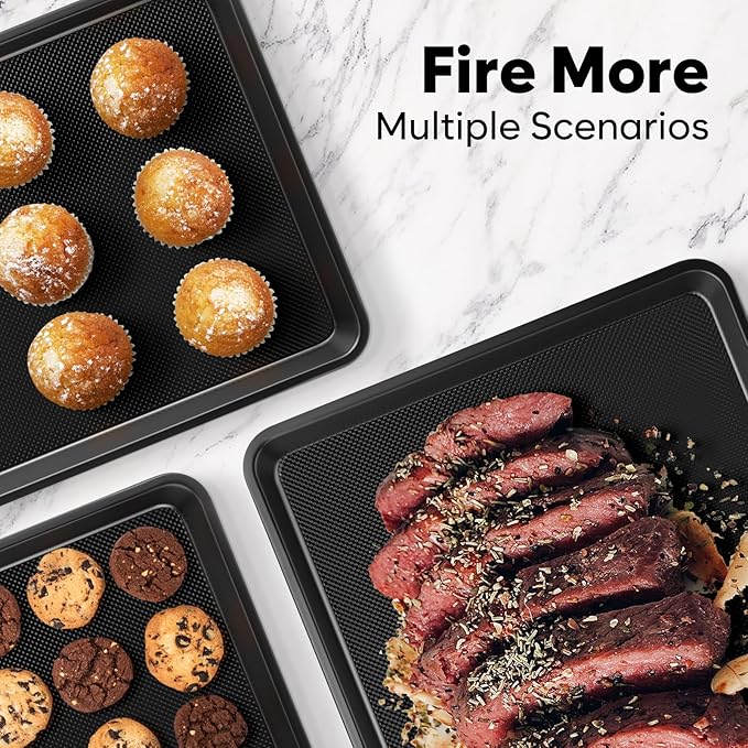 - Premium Thickened Material: No More Warped Pans! The reinforced steel edges of the baking tray also significantly improve its overall durability. Heavy-duty 0.8mm carbon steel withstands 450Β°F heat without bending β perfect for crispy bacon, giant cookie batches, and sizzling sheet pan dinners
