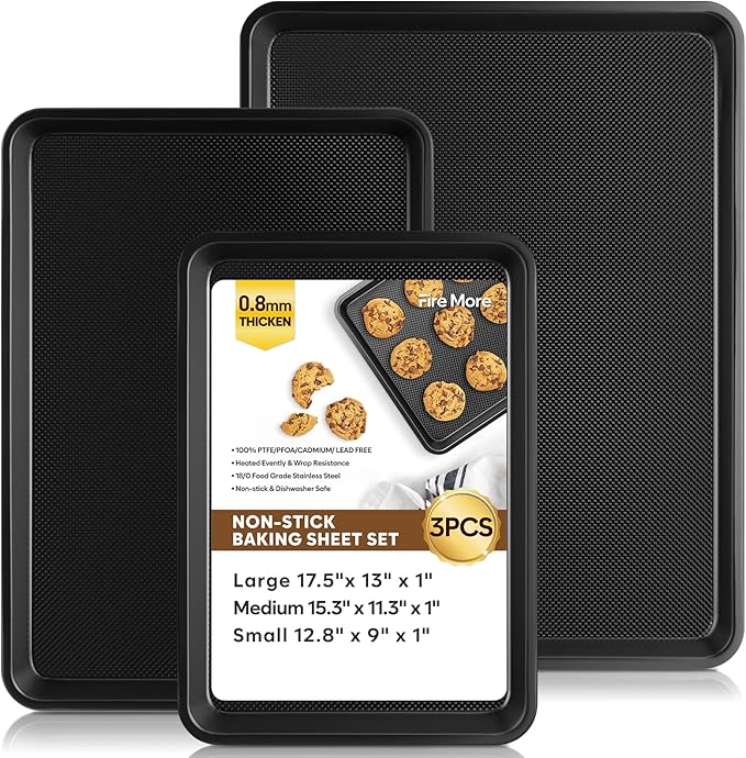 - Fits Your Feast: The baking sheet set includes 3 pack 0.8mm thick carbon steel baking pans. Fits standard oven racks and big feasts! 17.5"x13"x1" + 15.3"x11.3"x1" + 12.8"x9"x1"pans hold a 20lb turkey, 2 dozen cookies, or a full family meal. Perfectly meets your baking needs