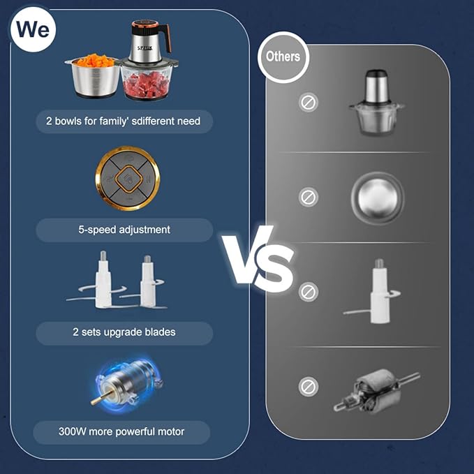 - 【Dual Bowls for Hygiene & Versatility】Includes both a glass and SUS 304 stainless steel bowl to Avoid confusion due to different uses. Use the meat chopper and vegetable chopper separately, ensuring food safety and hygiene.